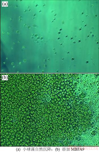 图3 小球藻自然沉降与添加MBFA9的显微照片