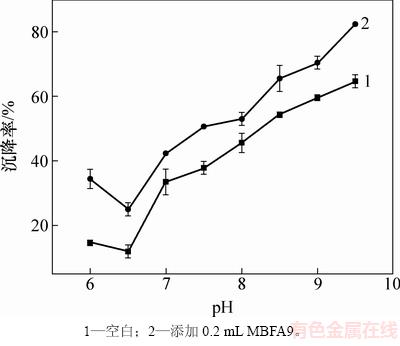 小球藻在指数生长早期时加入MBFA9后沉降率较低,故考虑pH对其沉降率的影响。取指数生长早期小球藻100 mL,调节pH分别至6.0,6.5,7.0,7.5,8.0,8.5,9.0和9.5,加入0.2 mL MBFA9。pH对小球藻沉降率的影响结果见图4。从图4可见:当pH降至6.0时,小球藻几乎不发生沉降;当藻液pH升至7.0及以上时,小球藻开始凝结;当pH=7.0~8.5时,小球藻发生团聚,但是这些团聚的小球藻仍然分散在培养液中,且其对应沉降率还较低;当pH升至9.5时,小球藻发生进一步团聚,形成更大的团块,在几分钟内快速沉降,自沉降率可达60%左右。由于小球藻表面带有羧酸(—COOH)与胺(—NH2),当溶液中 pH>4时,—COOH会解离成—COOH-,—NH2不带电荷,这导致小球藻细胞在pH>4时带负电荷[27-28]。由于营养液中含有MgSO4·7H2O,Ca(NO3)2·4H2O和柠檬酸铁会解离成Mg2+,Ca2+和Fe3+,在碱性条件下会发生水解形成不易溶的带正电荷的沉淀物,并通过网捕卷扫和静电中和作用凝聚带负电荷的小球藻细胞,这与YANG等[29]的研究结果相似。WU等[30]通过ICP-AES测定营养液中离子浓度的变化,Mg2+在沉降前后浓度明显下降,这表明Mg2+在高pH条件下形成Mg(OH)2,带正电荷的沉淀物中和了微藻表面的负电荷使其失去稳定性,同时,Mg(OH)2具有开链结构,即使很小的质量也能提供有效的体积分数高的结合微藻细胞。VANDAMME等[31]通过测定沉降前后离子浓度和添加EDTA确定升高pH对诱导小球藻沉降过程中Mg2+和Ca2+是否起到重要作用,发现Mg2+在升高pH诱导小球藻沉降过程中起重要作用。添加MBFA9后,沉降率可相应地增大10%~20%,这可能是MBFA9的主要成分为多糖,其相对分子质量较大,且具有多聚链结构,可以在适宜条件下使分散状态的块状小球藻细胞迅速结合成网状结构,形成大的凝聚体而沉积,从而加快沉降速率,提高沉降率。