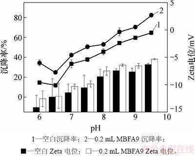 胶体颗粒在液体中是带电的。当固体与液体接触时,固-液两相界面上就会带有相反符号的电荷。Zeta电位是表征胶体分散体系稳定性的重要指标[32]。若颗粒带有许多负电荷或者正电荷,也就是说当Zeta电位的绝对值很高时,则它们就会相互排斥,整个体系具有较高的稳定性;反之,Zeta电位的绝对值很低,它们就会相互吸引,整个体系就会不稳定,容易生成沉淀物。胶体从稳定地悬浮在液体中到稳定性遭到破坏发生沉降的过程中,体系的Zeta电位是1个重要参数,它是决定1个悬浮胶体体系是否稳定的重要因素[32],因此,通过测定自然沉降后小球藻细胞和添加MBFA9小球藻细胞的Zeta电位来探讨MBFA9沉降小球藻的机理。当Zeta电位绝对值大于30 mV时,认为溶液体系稳定,不产生沉淀;当Zeta电位为0 mV时,溶液pH是该胶体颗粒的等电点,此时体系最不稳定,容易生成沉淀物。胶体从稳定地悬浮在液体中到稳定性遭到破坏发生沉降的过程中,体系的Zeta电位是决定悬浮胶体体系是否稳定的重要因素[32]。因此,本文通过测定自然沉降后小球藻细胞和添加MBFA9以后小球藻细胞的Zeta电位来探讨MBFA9沉降小球藻的机理。小球藻在不同pH下的Zeta电位及沉降率见图6。从图6可以看到:营养液中的pH会影响Zeta电位和沉降率;当pH从6.0升至7.5时,添加MBFA9后的小球藻Zeta电位逐渐升高到-9.87 mV,此时,小球藻自沉降率为37.8%,投加MBFA9后的沉降率为52.9%;当pH升高至9.5时,添加MBFA9后,小球藻Zeta电位升高至-5.33 mV,此时,絮凝率最高,为82.67%;当pH从6.0升至9.5时,小球藻的Zeta电位绝对值从14.15 mV降至6.32 mV,添加MBFA9后,小球藻Zeta电位从12.56 mV降至3.71 mV,这是因为溶液中的Ca2+和Mg2+易形成带正电荷的沉淀物,中和小球藻表明的负电荷,溶液的稳定性急剧下降,小球藻细胞间的相互作用增强,有利于小球藻细胞的聚集。最佳沉降率时小球藻的Zeta电位等电点量表明:在沉降过程中,除了金属阳离子形成的正电荷与小球藻表面细胞的负电荷发生吸附电中和作用外,还有MBFA9的架桥作用,因此,沉降效率有所提高。