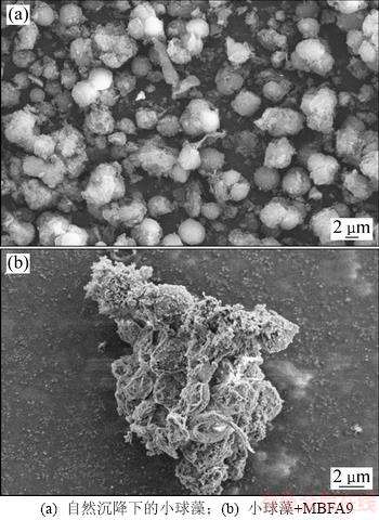 图7 小球藻在自然沉降与添加MBFA9条件下的FESEM