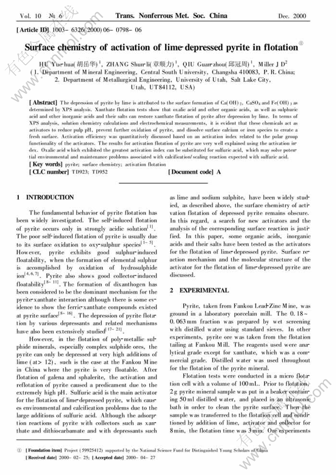 论文作者:胡岳华 章顺力 邱冠周 J.D.Miller