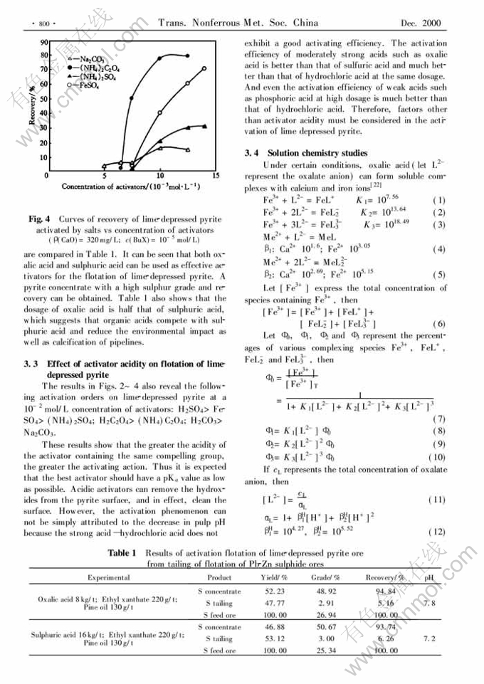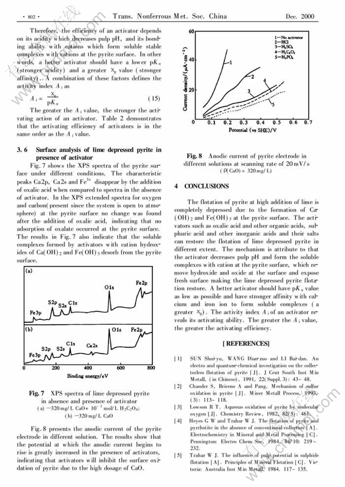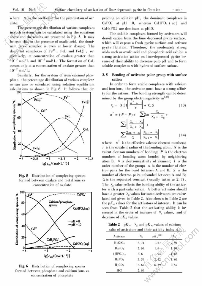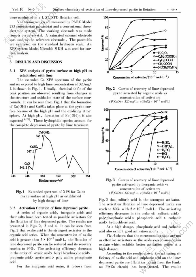 Abstract: The depression of pyrite by lime is attributed to the surface formation of Ca(OH)2, CaSO4 and Fe(OH)3 as determined by XPS analysis. Xanthate flotation tests show that oxalic acid and other organic acids, as well as sulphuric acid and other inorganic acids and their salts can restore xanthate flotation of pyrite after depression by lime. In terms of XPS analysis, solution chemistry calculations and electrochemical measurements, it is evident that these chemicals act as activators to reduce pulp pH, prevent further oxidation of pyrite, and dissolve surface calcium or iron species to create a fresh surface. Activation efficiency was quantitatively discussed based on an activation index related to the polar group functionality of the activators. The results for activation flotation of pyrite are very well explained using the activation index. Oxalic acid which exhibited the greatest activation index can be substituted for sulfuric acid, which may solve poten- tial environmental and maintenance problems associated with calcification/scaling reaction expected with sulfuric acid.