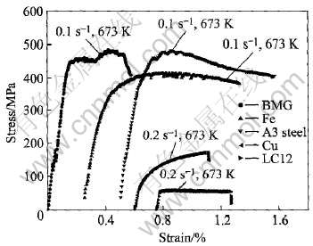 静液挤压工艺在采用包套时, 包套与芯料间的变形特性越相近越好, 这样可以避免在两者之间的界面上产生附加拉应力。 因此, 采用Gleeble1500热模拟实验机进行非晶、 纯铁、 A3钢、 紫铜和LC12硬铝等材料试样的高温压缩实验, 选择与非晶试样具有相近变形行为的材料作为挤压包套材料。 样品的应变速率分别为0.2和0.1s-1, 变形温度为673K, 结果如图1所示。