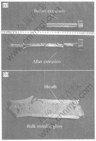 Fig.2 Photo of hydrostatically extruded Zr41.2Ti13.8Cu12.5Ni10Be22.5 amorphous alloy with A3 carbon steel sheath(a) and longitudinal cross-section of extruded sample (b)