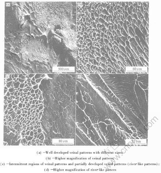 Fig.3 Fractural morphologies of hydrostatically extruded Zr41.2Ti13.8Cu12.5Ni10Be22.5 amorphous alloy