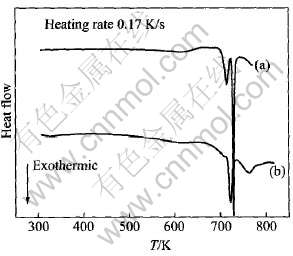 Fig.5 DSC curves of as-cast(a) and hydrostatically extruded(b) Zr41.2Ti13.8Cu12.5-Ni10Be22.5 amorphous alloy