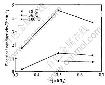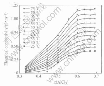 1) 在x(AlCl3)〈0.667的区域内, 随着x(AlCl3)的增加, 离子液体电导率升高; 在0.667〈x(AlCl3)〈0.692的区域, x(AlCl3)对电导率的影响很小。