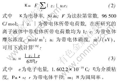 由于通过离子液体的电流是由离子的运动完成的, 所以电导率是所有带电体对电导率贡献的总和, 故电导率可以表示为[16]