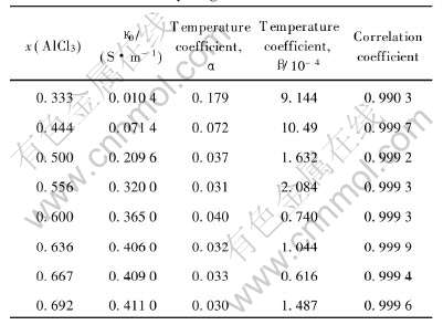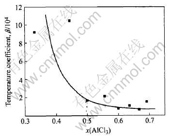 温度系数β随着x(AlCl3)的增大而下降; 在x(AlCl3)>0.5的区域, x(AlCl3)对于β的影响不明显。 温度系数β随x(AlCl3)变化的原因与温度系数α的情形类似。