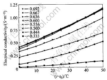Fig.3 Relationship between electrical conductivity and temperature at various x(AlCl3)