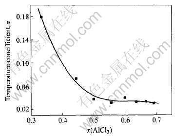 图4 温度系数α与x(AlCl3)的关系