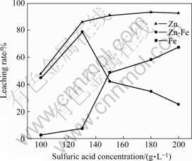 It can be seen from Fig.1 that as the sulfuric acid concentration increases from 100 g/L to 130 g/L, the leaching rate of zinc increases distinctly while the leaching rate of iron increases slowly, but the result is reversed as the sulfuric acid concentration rises from 130 g/L to 200 g/L. The pH value of leaching solution with sulfuric acid concentration of 100 g/L is 6.23 and the hydrolysis pH values of Fe2+ and Fe3+ are 6.0 and 1.8 respectively. The reactions are as follows.