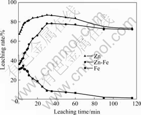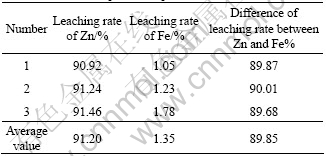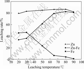 The leaching rate of zinc and the difference of leaching rate between zinc and iron are 86.47% and 82.24% respectively at 80 ℃, while the leaching rate of zinc at 65 ℃ is only 0.3% lower than that at 80℃ and the difference of leaching rate between zinc and iron is 79.22%. The rational leaching temperature is 65 ℃ because high temperature leads to high evaporation speed and energy consumption.
