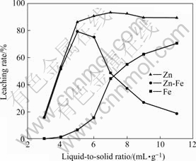 As shown in Fig.4, the leaching rates of zinc and iron are very low when the liquid-to-solid ratio is between 3 and 4. They increase sharply from 16.03% to 86.03% with the liquid-to-solid ratio from 3 to 5 and increase slowly from 5 to 8, finally descend with the liquid-to-solid ratio over 8. The leaching rate of iron increases slightly from 0.31% to 6.92% with the liquid-to-solid ratio rising from 3 to 5 and increases sharply with the liquid-to-solid ratio gradually increasing, finally the leaching rate of iron is 70.23% when the liquid-to-solid ratio increases to 11. The leaching rate of zinc increases slowly with the liquid-to-solid ratio over 5. This is because most of the zinc compounds dissolve with liquid-to-solid ratio rising from 3 to 5 and there are only a few indissolvable zinc compounds dissolved with the liquid-to-solid ratio over 5. The leaching rate of iron increases obviously because the reactions between iron compounds and sulfuric acid are strengthened with liquid-to-solid ratio gradually increasing. The analysis results indicate that the rational liquid-to-solid ratio is 5 with the leaching rate of 86.03% and the difference of leaching rate between zinc and iron is the greatest, therefore the efficiency of sulfuric acid is the highest(79.11%).