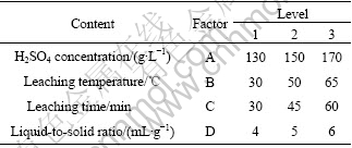 The effects of sulfuric acid concentration, leaching temperature, leaching time and liquid-to-solid ratio were investigated by orthogonal experiment. The factor level of the orthogonal experiment is shown in Table 2.