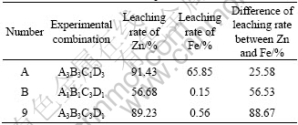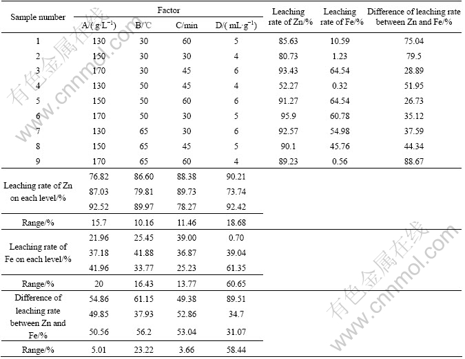 In order to study the effect of sulfuric acid concentration, leaching temperature, leaching time and liquid-to-solid ratio on the leaching rates of zinc and iron, data-handing software was used to optimize the conditions of leaching process by fitting the results gained in orthogonal experiments.