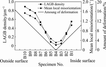 根据中性层位置及弯曲半径,按照线性分布规律近似计算出样品B距中性层任意距离处的变形量,如图4中的直实线所示。分别用小角晶界密度、平均局部取向梯度和变形量表示弯曲样品B沿厚度方向不同区域的形变程度,小角晶界密度和局部取向梯度为微观参数,表征结果基本相同,与测试位置的关系都是非线性的;形变量是宏观参数,表征结果与小角晶界密度和平均局部取向梯度有较大差异。微观参数能够更合理反应出材料的应变分布,图4说明U形弯曲样品在厚度方向上的应变分布不是线性的。