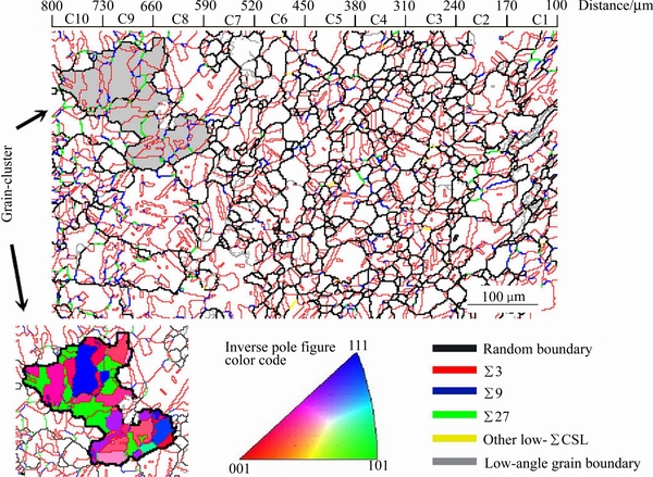 EBSD测得退火处理后样品C的晶界网络分布如图5所示,测试区域位置大概与退火前的EBSD测试区域B相同。由图5可见,沿样品厚度方向不同区域(C1~C10)的晶界网络有明显差异。C1~C7区域的随机晶界密度明显比C8~C10区域高,其中C1~C3和C6~C7区域含有较多的小角晶界。C8~C10区域含有大量的∑3n类型晶界,低∑CSL晶界比例明显较高,构成了大尺寸的“互有∑3n取向关系晶粒的团簇”[16-17]:晶粒团簇(Grain-cluster)内都是∑3n类型晶界,因此也叫孪晶相关区域;边界为取向上随机形成的晶界,一般是随机晶界,如图5中灰色所示区域是一个晶粒团簇。