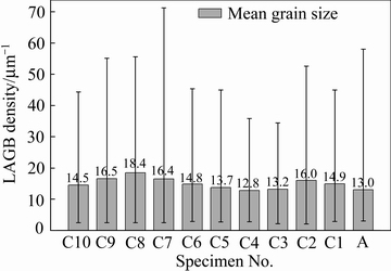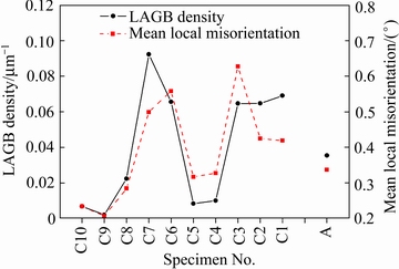 Fig. 8 Low angle grain boundary (LAGB) densities and mean local-misorientations of specimen A and regions C1-C10 in specimen C