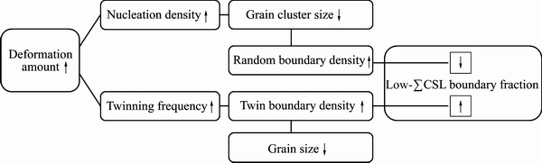 Fig. 9 Effects of deformation amount on grain-cluster size, grain size and low-∑CSL boundary proportion of GBE processed sample