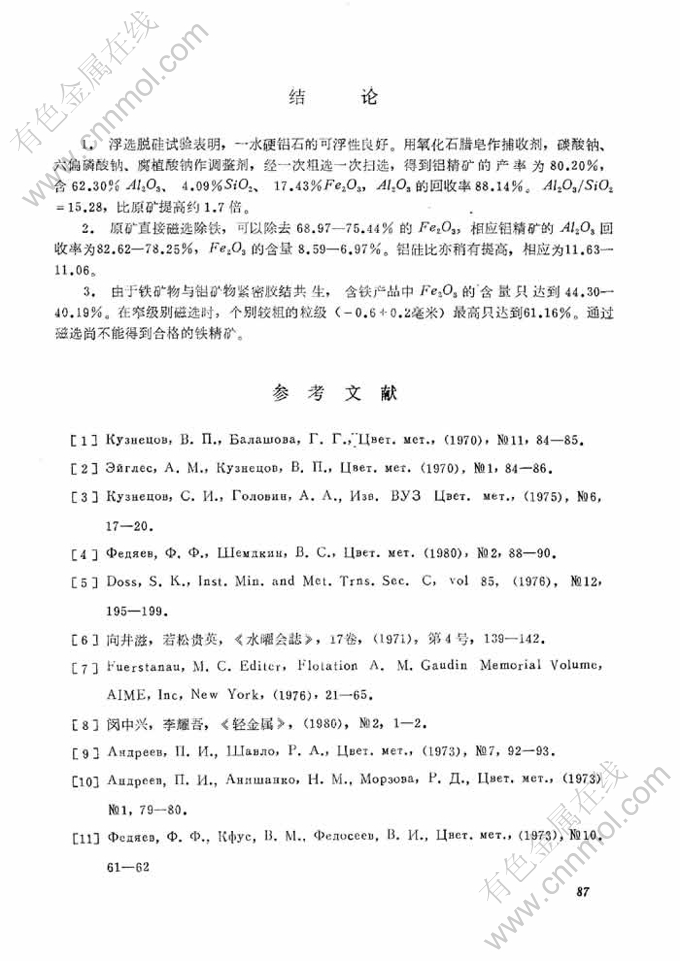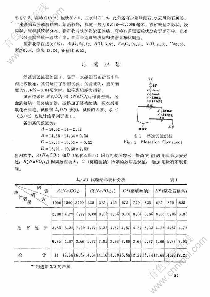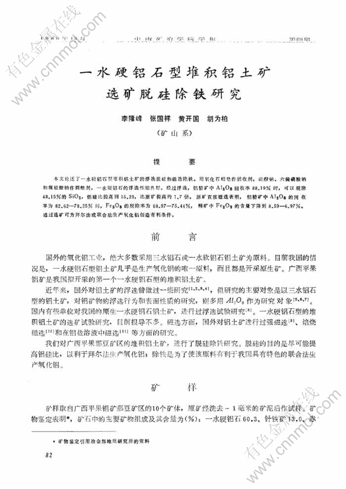 关键词:堆积铝土矿; 捕收剂; 氧化石蜡皂; 选矿脱硅; 磁选流程; 浮选脱硅; 磁选除铁; 六偏磷酸钠; 铝硅比; 联合法