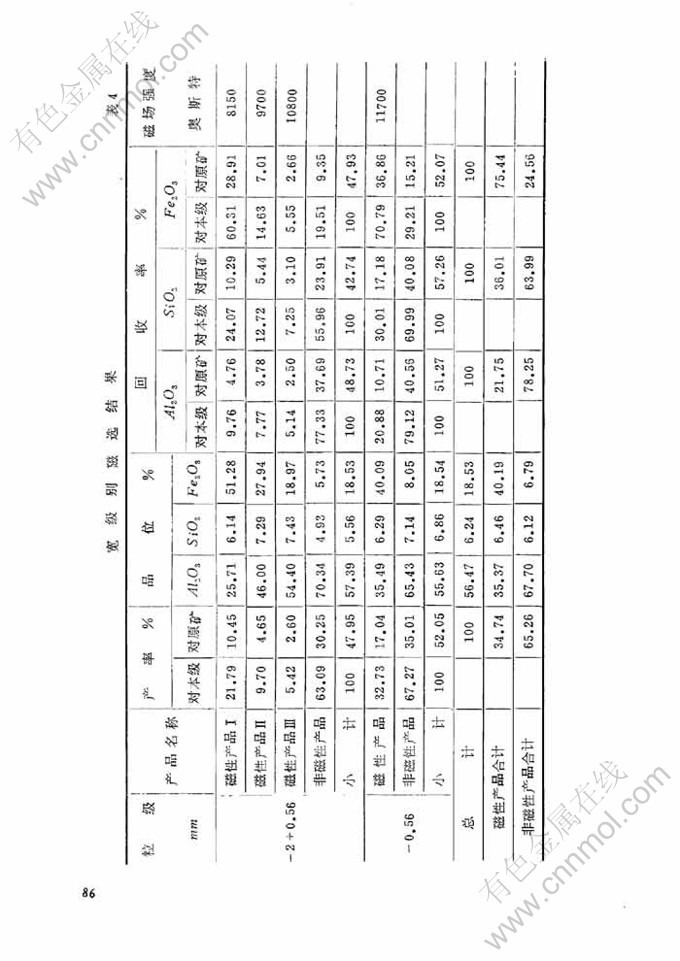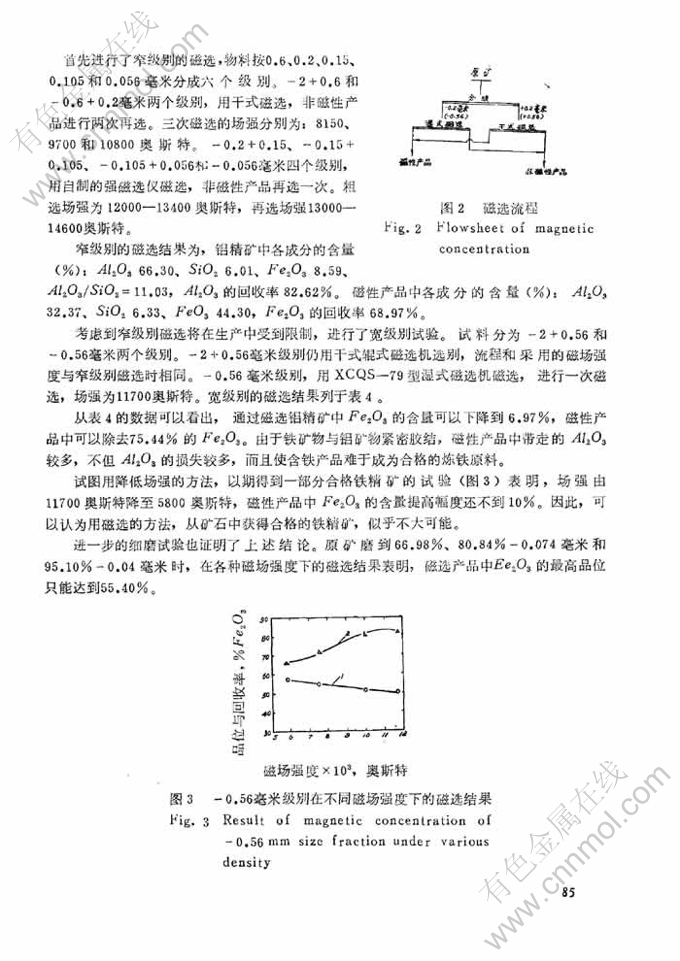 摘 要:本文论述了一水硬铝石型堆积铝土矿的浮选脱硅和磁选除铁。用氧化石蜡皂作捕收剂,碳酸钠、六偏磷酸钠和腐植酸钠作调整剂,一水硬铝石的浮选性能良好。经过浮选,铝精矿中Al2O3回收率88.19%时,可以脱除48.15%的SiO2,铝硅比提高到15.23,比原矿提高约1.7倍。原矿直接磁选表明,铝精矿中Al2O3的回收率为82.62—78.25%时,Fe2O3的脱除率为68.97—75.44%,精矿中Fe2O3的含量下降到8.59—6.97%。通过选矿可为拜尔法或联合法生产氧化铝创造有利条件。