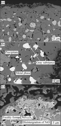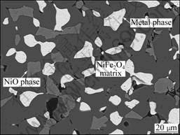 4.29% (molar fraction) Fe and 25.10% (molar fraction) Ni. The content of Ni in this metal phase was much higher than that in the original Cu-Ni metal powder, which was 10% (mass fraction). NiO phase contained 8.29% Fe. The molar ratio of Fe to Ni in NiFe2O4 phase was 2.91, much higher than the theoretical value of 2. Similar phenomena of the increase of Ni content in the metal phase and the existence of Fe element in NiO phase were also reported by ALCOA[2] and OLSEN and THONSTAD[6]. These were attributed to either the exchange reaction among Cu, NiO and NiFe2O4[2], or the thermal reduction by residual carbon and the decomposition products of the organic solvent and additives[6]. Another possible explanation for a high Fe content in NiO phase can be the solution of NiFe2O4 in NiO phase during the sintering process. The solubility of Fe element in NiO phase increases with lowering the oxygen partial pressure and raising the temperature in Fe2O3-NiO pseudo-binary system. The molar ratio of Fe to (Ni+Fe) in NiO phase can rise up to 0.2 at 1 300 °C in