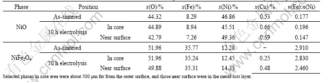 Table 2 presents the compositions of NiFe2O4 and NiO phases in the metal-lost layer and the core part after electrolysis for 10 h. The contents of oxygen and Fe elements in the NiO phase became less in the metal-lost layer than those in the core region, and the same tendency existed for the oxygen content and Fe to Ni molar ratio in NiFe2O4 phase. Since the peaks of Al, F and other elements from the electrolyte were unobvious in the EDS spectra, the compositional changes in NiO and NiFe2O4 phases were not induced by the reactions between the ceramic phases and the electrolyte, but mainly attributed to the diffusion reaction between NiO and NiFe2O4 phases in the formation of the dense ceramics layer, which could be confirmed by the fact that NiO phase was swallowed by NiFe2O4 phase, as shown in Fig.3(c).