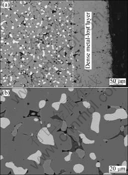 Fig.4 shows the microstructures of the polished cross-sections near the surface and the core part of an anode sample after electrolysis for 40 h. Compared with the anode sample after electrolysis for 10 h, the thickness of the metal-lost layer increased to ~150 μm, and became denser than the anode material itself. Inside the metal-lost layer, NiO phase disappeared as well. This is the first time of such an observation on the disappearance of NiO phase inside the metal-lost layer. OLSEN and THONSTAD[7] reported NiO phase still existed in a 50 μm-thick metal-lost layer after electrolysis for 50 h, and