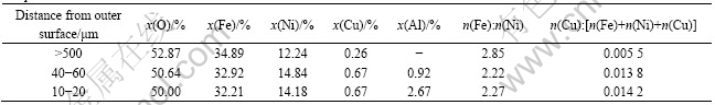 The contents of the gray substance showed a clear discrepancy in the three types of samples, i.e. the outer layer of a 10 h-electrolyzed sample, the core area of a 40 h-electrolyzed sample and the as-sintered sample, with an order of contents from the high to the low, as shown in Fig.3(b), Fig.4(b) and Fig.2, respectively. In the outer layer of a 10 h-electrolyzed sample, EDS analysis was performed on the gray substance and the metal phase in the areas of 30-50 μm away from the surface. Table 1 presents the EDS analysis results. In the gray substance, the oxygen content increased and the molar ratio of Ni to Cu decreased compared with the metal matrix. But the oxygen content in the metal phase decreased only slightly compared with that in the as-sintered sample.
