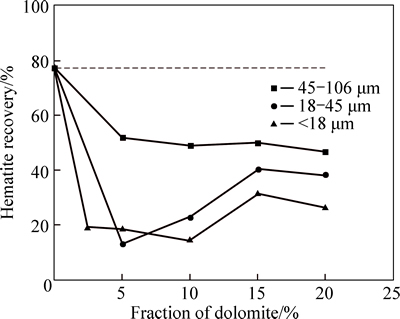 Fig. 1 Hematite recovery as function of fraction of dolomite with different size fractions (sodium oleate dosage: 120 mg/L; pH: 8.93-9.11; 2.0 g sample composed of dolomite and hematite in different proportions by mass)