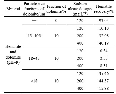Hematite recovery as a function of sodium oleate dosage in the presence of dolomite (fraction is 10%) using sodium oleate as collector at pH about 9 is shown in Table 1. The results indicate that the hematite recovery in presence of dolomite increases slightly with the sharp increase of sodium oleate dosage, but much less than that in the absence of dolomite.
