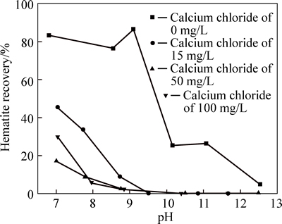 Fig. 2 Hematite recovery as a function of pH and calcium chloride dosage (sodium oleate dosage: 120 mg/L)