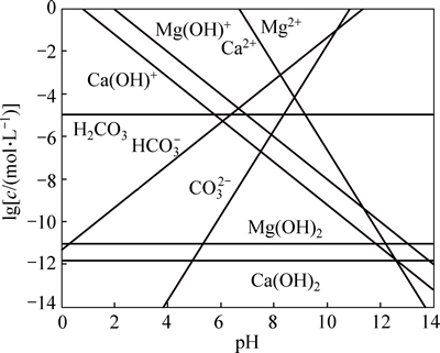 Different composition concentration dissolved from dolomite as a function of pH is shown in Fig. 3 according to formulae (1) to (9). Figure 3 shows that HCO3- and CO32- in the solution are the main ions in alkaline condition, and Ca2+, Mg2+ and their hydroxide complexes are the principal ions in neutral and acidic condition.