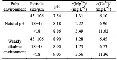 The concentration of Ca2+ and Mg2+ dissolved species of dolomite with different size fractions after stirring for 8 min in distilled water was measured by means of ICP-AES at natural pH and at pH of about 9 respectively. The results shown in Table 3 indicate that at natural pH, the concentration of Ca2+ and Mg2+ ion increases with decreasing the particle size of dolomite. Meanwhile, the same trend at pH of about 9 appears. That indicates that the smaller particle size of dolomite is, the more easily dolomite dissolves.
