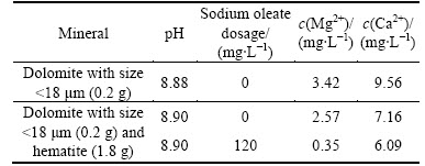 In order to confirm that the adsorption of ion dissolved from dolomite onto hematite occurs, take dolomite with <18 μm size for example, Ca2+ and Mg2+ ion concentration in dissolution of dolomite after stirring for 8 min at pH about 9 as a function of hematite content and sodium oleate dosage is measured. It can be seen from Table 4 that the concentration of Ca2+and Mg2+ in dolomite dissolution in presence of hematite decreases compared with that in absence of hematite. The results indicate that the adsorption of Ca2+and Mg2+ dissolved species of dolomite onto hematite occurs. Meanwhile, It can be also seen that the concentration of Ca2+and Mg2+ in dolomite and hematite dissolution decreases in presence of sodium oleate with a dosage of 120 mg/L in contrast to that in absence of sodium oleate. The results demonstrate that part of sodium oleate can be consumed by Ca2+and Mg2+ dissolved species of dolomite, which results in decreasing the adsorption of sodium oleate onto hematite.