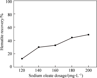 Fig. 4 Hematite recovery as a function of sodium oleate dosage in the presence of 15 mg/L calcium chloride at pH 9
