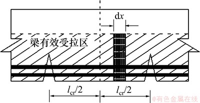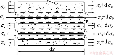 在裂缝间距范围内任取一距离为dx的微单元(见图6),相应的有效受拉区应力传递如图7所示。