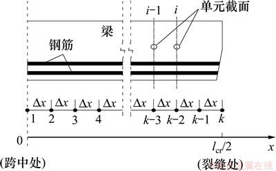 在纯弯段内,选取长度为lcr/2的梁体作为研究对象,并以相邻裂缝之间的跨中截面位置处作为起始点,划分k-1个距离为△x的单元,如图8所示。