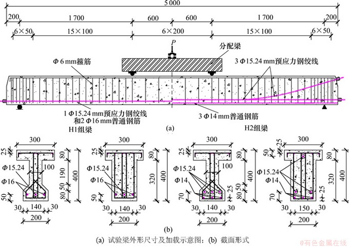 梁内非预应力钢筋采用直径为14 mm和16 mm 的HRB400级钢筋,相应的屈服强度分别为442 MPa和413 MPa;预应力钢绞线采用1860级7股钢绞线,张拉控制应力为1 302 MPa;箍筋和架立筋均采用HPB234级光圆钢筋,箍筋间距如图10(a)所示。各试验梁实测混凝土抗压强度、加载参数和试验结果如表1所示。