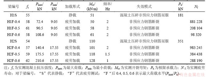静载以及疲劳试验均在1 MN的MTS疲劳试验机上进行,在疲劳试验过程中,当循环次数达到预定次数时,停机加静载至最大荷载,用裂缝观测仪测量各条裂缝在非预应力钢筋重心对应的梁侧面处的裂缝间距和裂缝宽度。