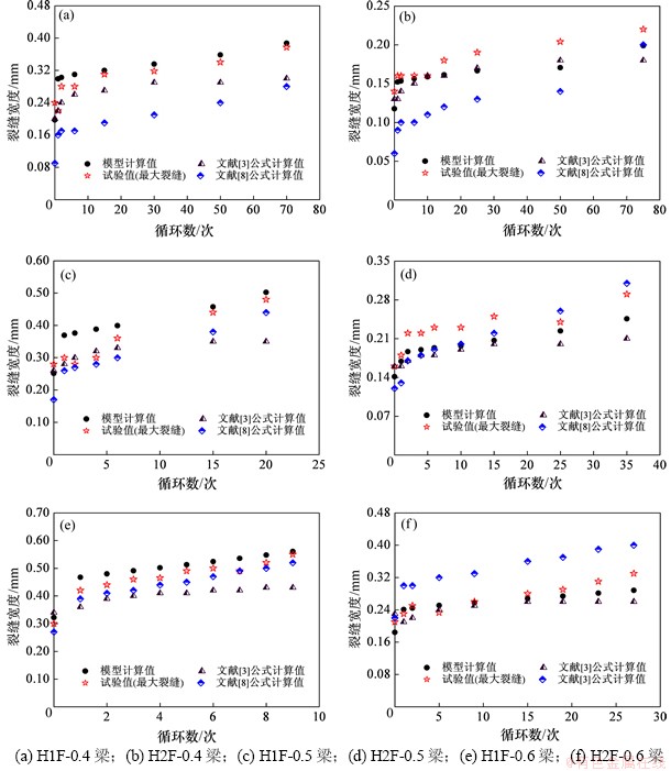 从图11可以看出:按照文献[3]的方法计算得到的最大裂缝宽度随着循环次数的增加,与试验结果的差异不断增大;对于应力水平较小的试验梁,按照文献[8]的方法计算得到的最大裂缝宽度与试验结果偏差较大(见图11(a)和11(b)),而采用本文所提出的疲劳裂缝宽度模型计算的裂缝宽度与试验结果较吻合,随循环次数的变化规律与试验结果相似。此外,对于配筋率较低的H1组梁而言,相应的模型计算值较试验数据相对保守,因此,该模型可作为PPC梁的抗疲劳设计和验算参考。