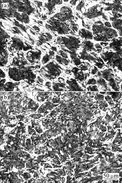 图1所示为普通白口铸铁试样在铸态下的金相组织照片。未经变质处理的试样中碳化物呈粗大的连续网状分布,如图1(a)所示;经复合变质处理后,共晶碳化物的连续部位出现断开,并以孤立块状存在,网状结构基本被破碎消除,同时,碳化物的颗粒变得更加孤立、细小,如图1(b)所示。