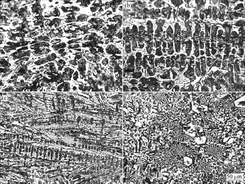 添加铬合金化后,白口铸铁中的碳化物呈现的多种形态与其含铬量和结晶过程密切相关。当含铬量较低时,共晶凝固开始,渗碳体为领先相,以边缘生长方式长大;而奥氏体相具有对称结构,能在与晶区基础平面相垂直的方向上长大,使邻接的液体中富碳,于是渗碳体在奥氏体突出物的孔隙中发芽生长,形成蜂房结构的莱氏体形态,如图2(a)和2(b)所示。