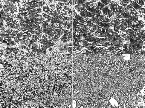 试样经机械抛光后,采用4%硝酸乙醇溶液浸蚀,金相显微组织在PLOYVAR MET金相显微镜下观察;碳化物定量分析在MeF3A金相显微镜和Q550图像定量分析仪上进行;硬度HRC在69-1型布洛维光学硬度计上测量,所加载荷为1.47 kN。