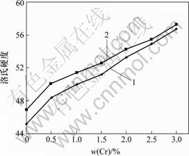 Fig.4 Relationship between hardness of white cast iron and chromium content before and after complex modification