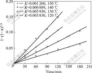 Fig.1 indicates that the influence of particle size on Zn leaching rate is remarkable. Zn leaching rate is raised markedly when the particle size is less than 50 μm. In order to examine the Zn leaching kinetics thoroughly, the samples of 75-80 μm are used for the subsequent experiment.