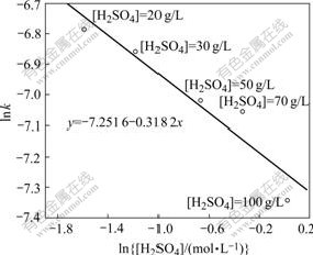 Fig.11 indicates that lnk′ is a linear function of ln[H2SO4], and the apparent reaction order of -0.318 2 can be found from the slope of the straight line. So, a kinetic equation about the effect of the initial sulfuric acid concentration on Zn leaching rate can be obtained as follows: