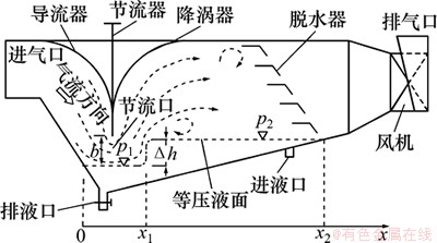 节流型自激式水幕除尘器结构原理如图1所示,含尘气流在通风机抽吸作用下流入除尘器,气流经导流器引导至节流器处加速后在节流口对除尘液面形成冲击,节流口前后产生节流液位差△h并同时产生大量高速运动的液滴,固相粉尘在冲击液面和与液滴接触时被捕捉,清洁气体经排气口排出。通过液床高度调节节流口初始过流面积,脱水器降低排气口液滴夹带量。