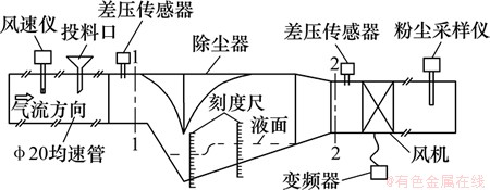 除尘器的长×入口宽×入口高为2 m×0.4 m×0.2 m,除尘风机最大流量3 026 m3/h,节流器末端距除尘腔底高130 mm,入口设置直径为200 mm的均速管,安装TES-1341型热线风速仪测量入口流速,风速仪后方适当位置设置粉尘投料口,JYB-DW型微差压传感器测量除尘器1-1和2-2截面处静压力,固定在节流口前后两侧的刻度尺测量节流液位差△h,变频器调节除尘器流速,实验系统及测点布置如图2所示。